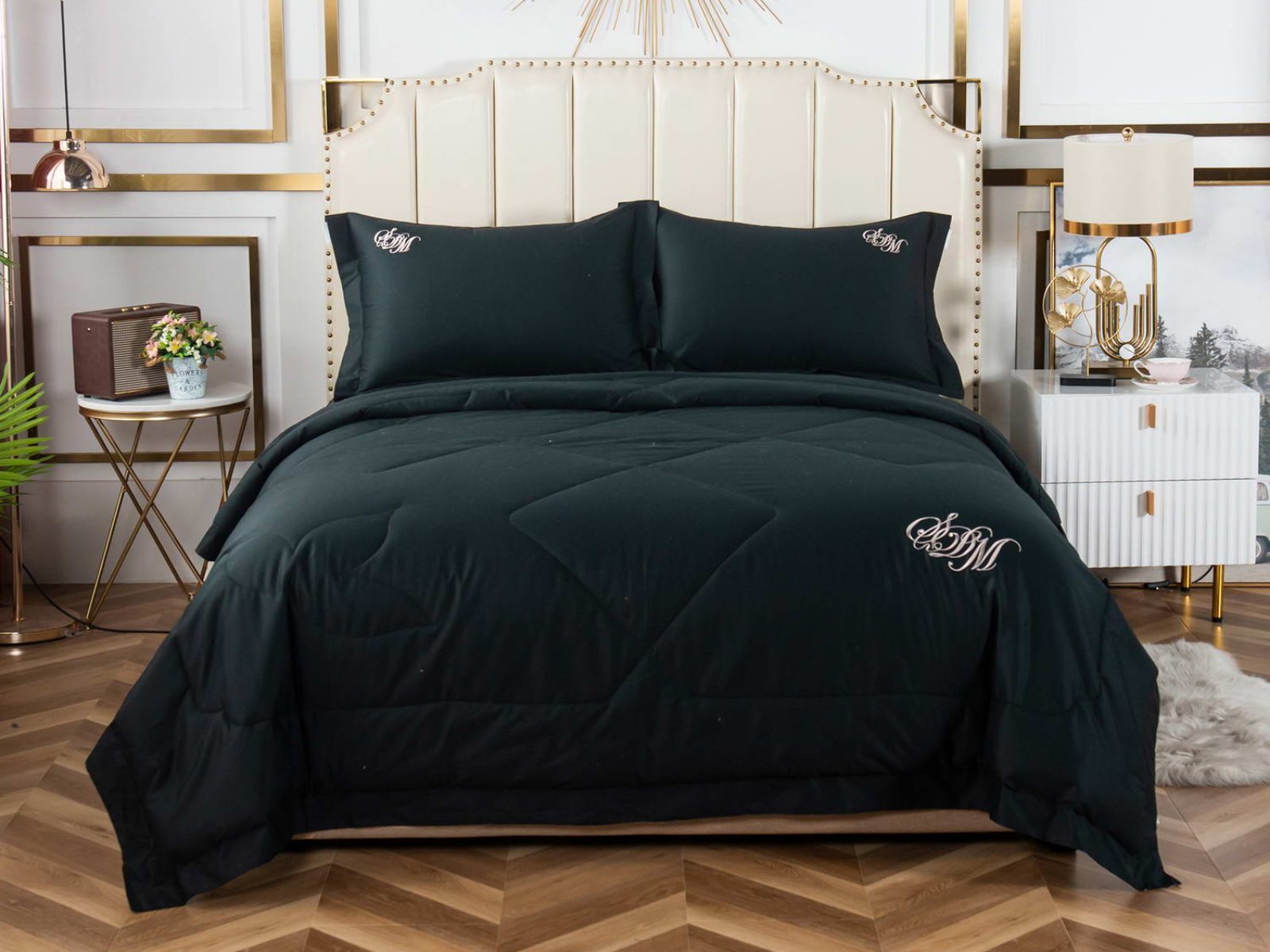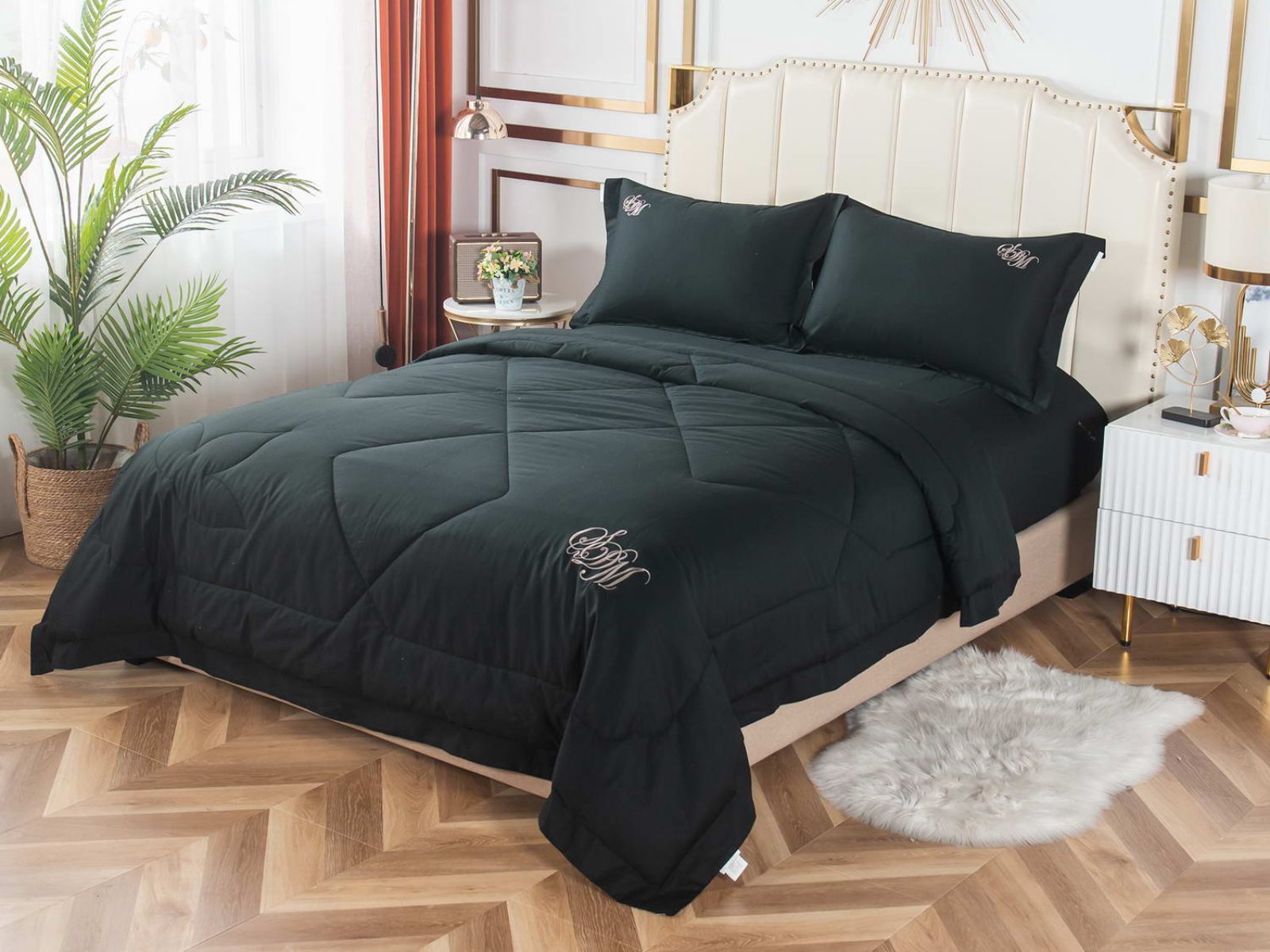 В комплект входят простыня, наволочки и одеяло. Одеяло простеганное, легкое и воздушное, его можно стирать в стиральной машине. Благодаря микроволокну в составе наполнителя для одеяла, оно всегда принимает свою начальную форму.