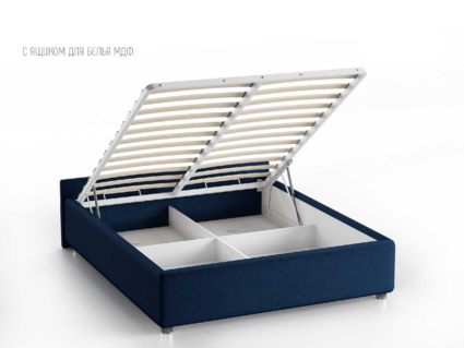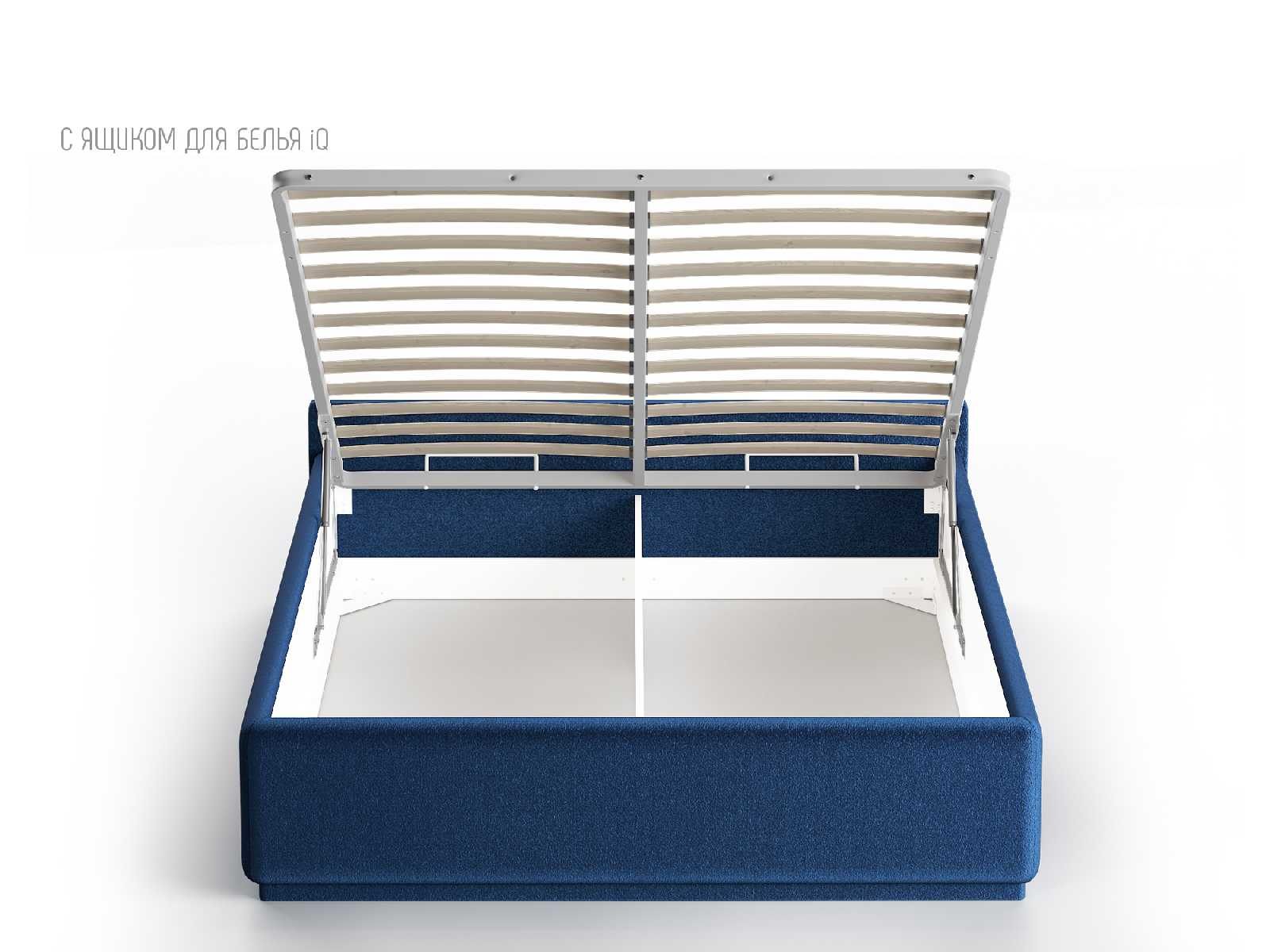 Кровать укомплектована IQ с подъемным механизмом и ящиком для белья без дна (дополнительная платная опция - дно к ящику IQ из HDF (ХДФ). Каркас кровати на цоколе, декоративный чехол на цоколе съёмный. Глубина ящика для белья - 30 см, без ограничения нагрузки на ящик.