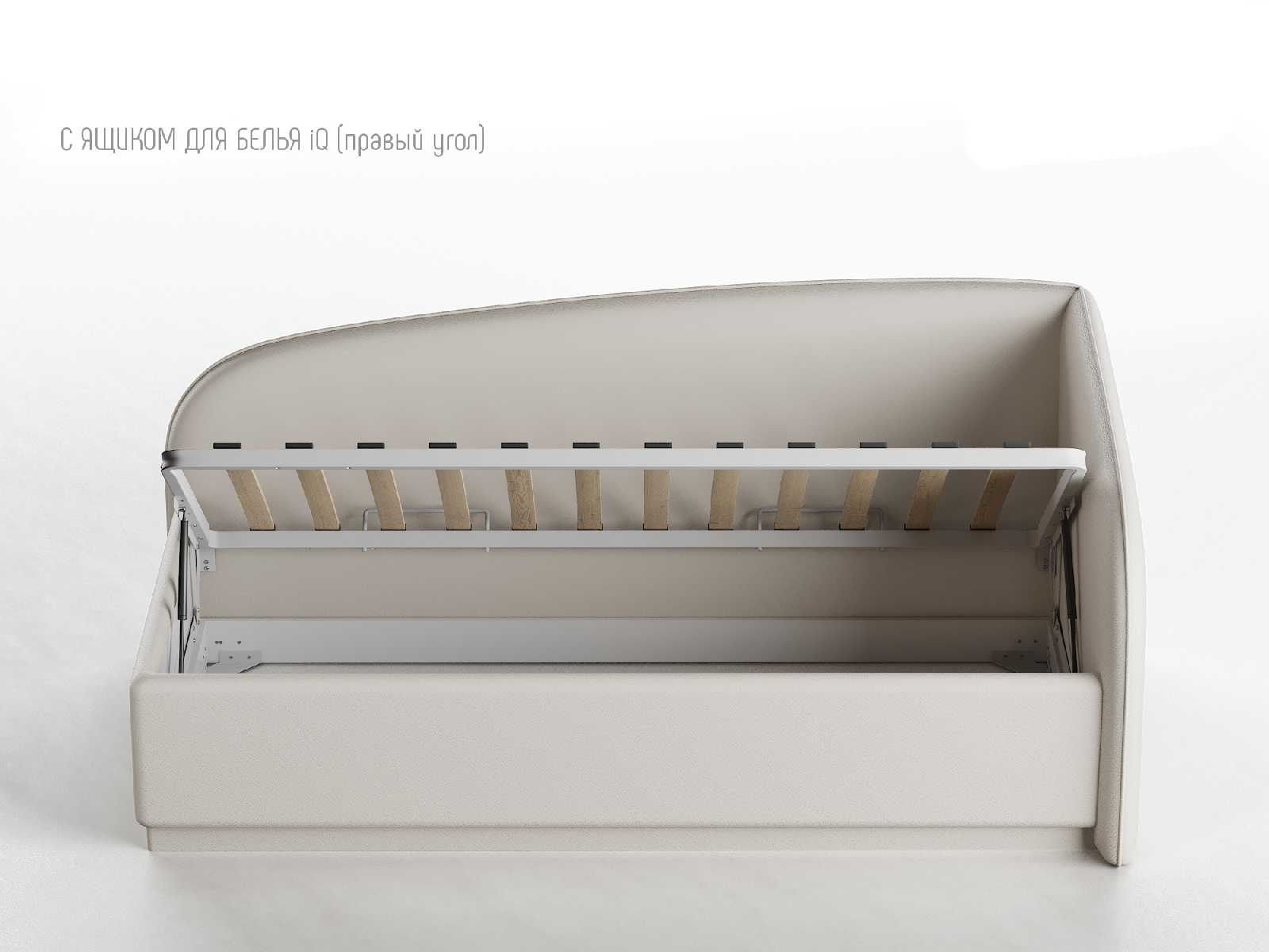 Кровать укомплектована IQ с подъемным механизмом и ящиком для белья без дна (дополнительная платная опция - дно к ящику IQ из HDF (ХДФ). Каркас кровати на цоколе, декоративный чехол на цоколе съёмный. Глубина ящика для белья - 30 см, без ограничения нагрузки на ящик.