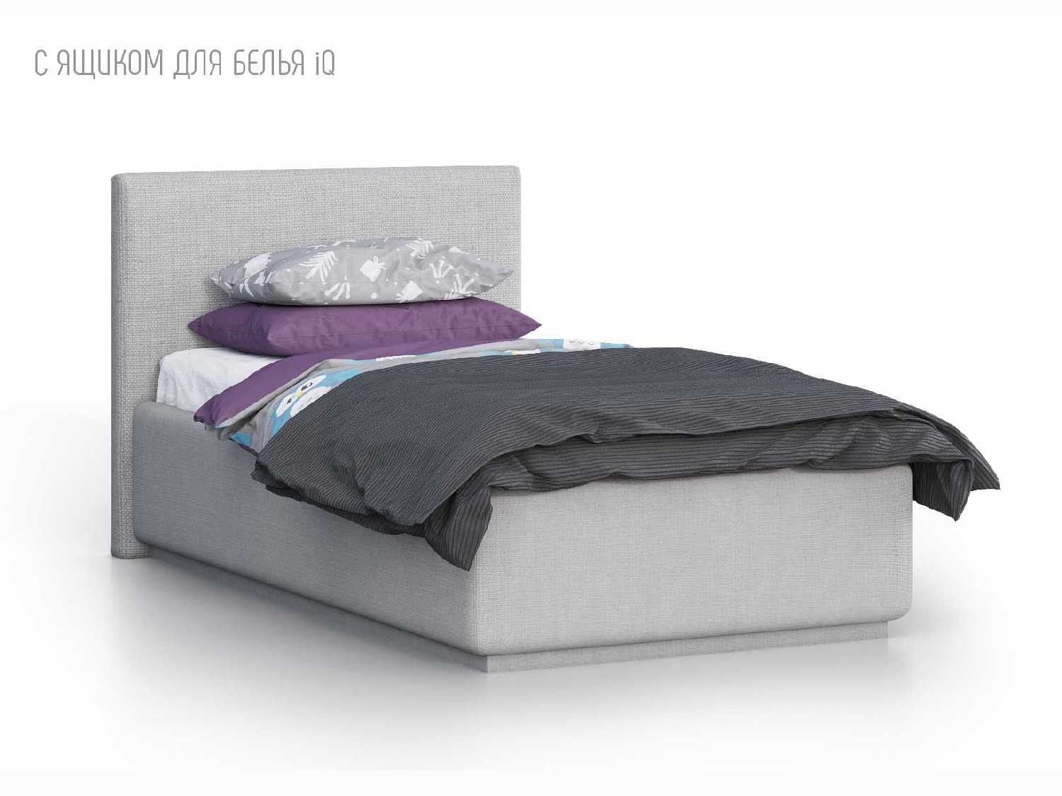 Кровать укомплектована IQ с подъемным механизмом и ящиком для белья без дна (дополнительная платная опция - дно к ящику IQ из HDF (ХДФ). Каркас кровати на цоколе, декоративный чехол на цоколе съёмный. Глубина ящика для белья - 30 см, без ограничения нагрузки на ящик.