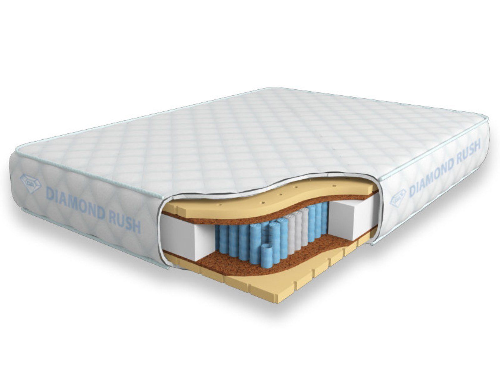 Матрас из серии Luxury Diamond имеет в своей основе независимый пружинный блок MultiZone, состоящий из пружин диаметром 3-4 см разной жесткости. В качестве настилочных слоев поверх пружинного блока используются листы латексированной кокосовой койры и листовой перфорированный натуральный латекс, они образуют среднюю жесткость.