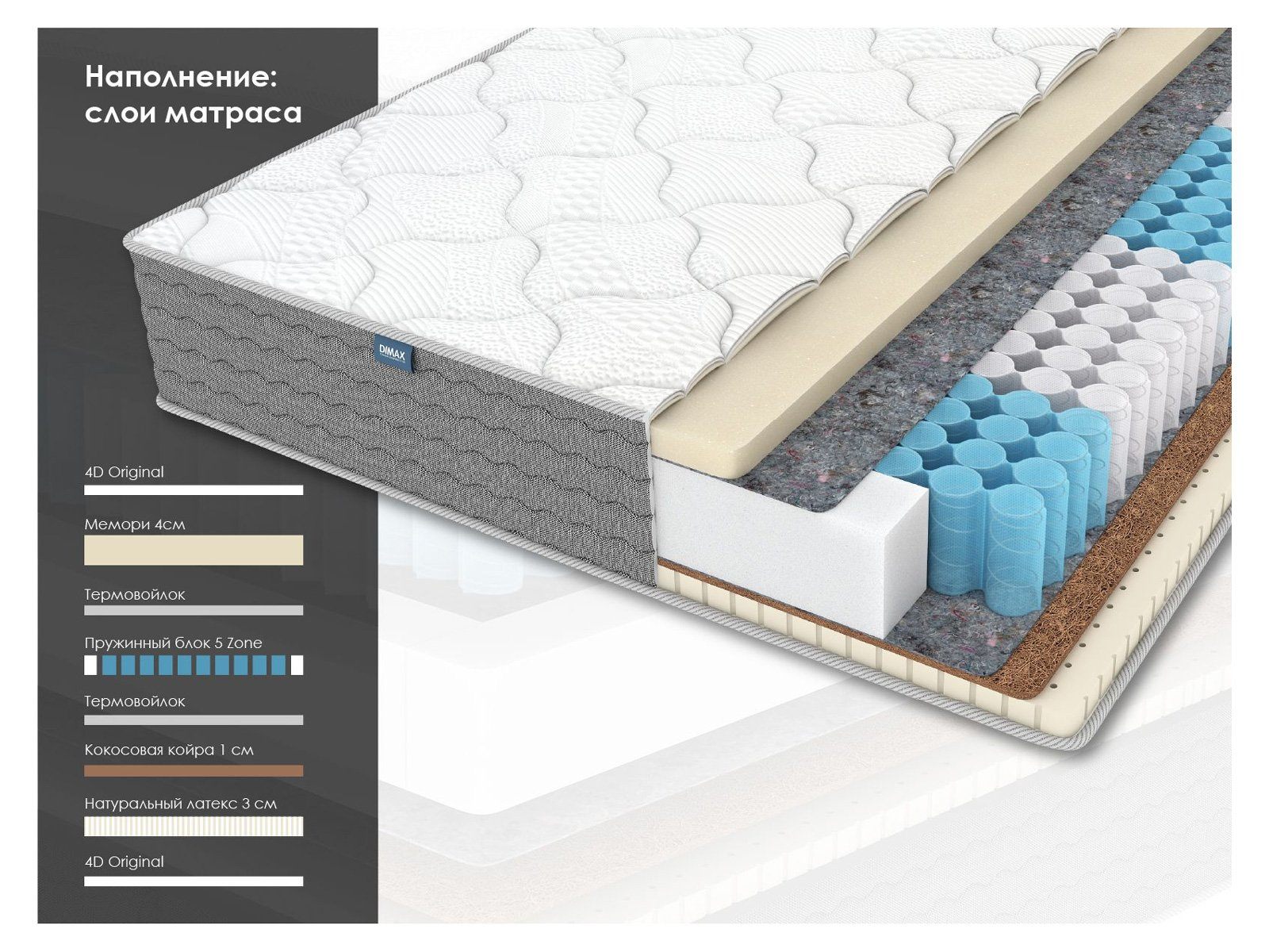 Димакс ОК Медиум Мемо – это двусторонний ортопедический матрас с эффектом памяти и разным уровнем жёсткости поверхностей: средним и мягким. В основе лежит 5-зональный пружинный блок, который сочетает автономную поддержку позвоночника и комфорт натуральных материалов, а пена Мемори даёт одну из самых нежных и обволакивающих поверхностей.